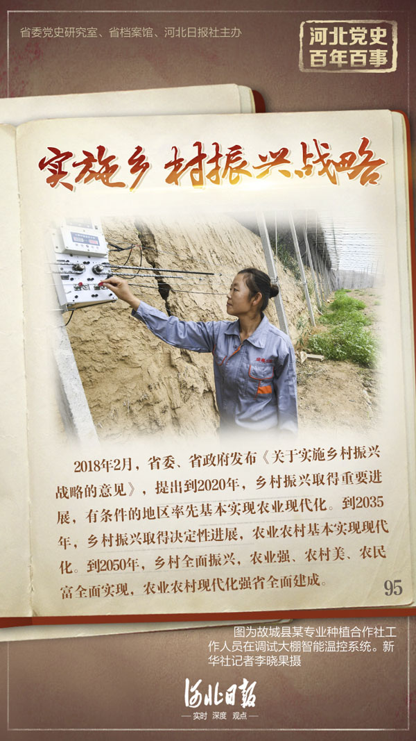 2018年2月,河北省委、省政府发布《关于实施乡村振兴战略的意见》,提出到2020年,乡村振兴取得重要进展,有条件的地区率先基本实现农业现代化。到2035年,乡村振兴取得决定性进展,农业农村基本实现现代化。到2050年,乡村全面振兴,农业强、农村美、农民富全面实现,农业农村现代化强省全面建成。坚持把农村人居环境整治作为实施乡村振兴战略的第一仗,河北省制定实施《农村人居环境整治三年行动实施方案(2018-2020年)》及生活垃圾集中治理、污水治理、农村改厕、国土绿化、村容村貌提升和深度贫困地区村庄面貌提升等专项推进方案,持续推进美丽宜居乡村建设,农村生态环境和人居环境得到明显改善。积极推动农村基础设施提档升级,着力加快城乡基本公共服务均等化进程。